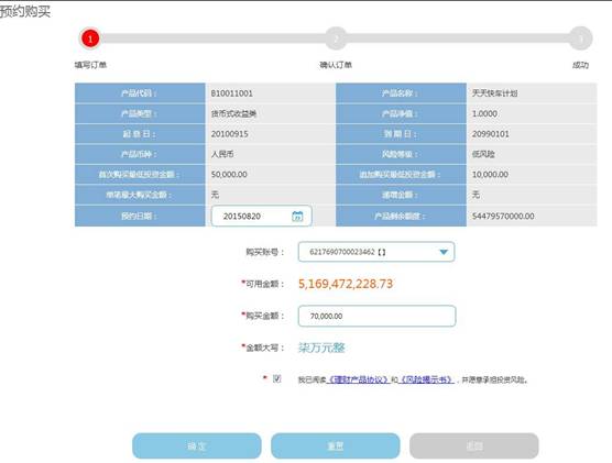 2、勾选“我已阅读《理财产品协议》及《产品揭示书》”,在预约购买页面输入购买金额和预约日期,如下图: