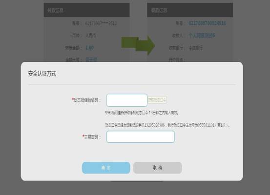 5.若选择安全验证方式为无证书+动态口令,输入手机短信验证码及交易密码即可转账成功。