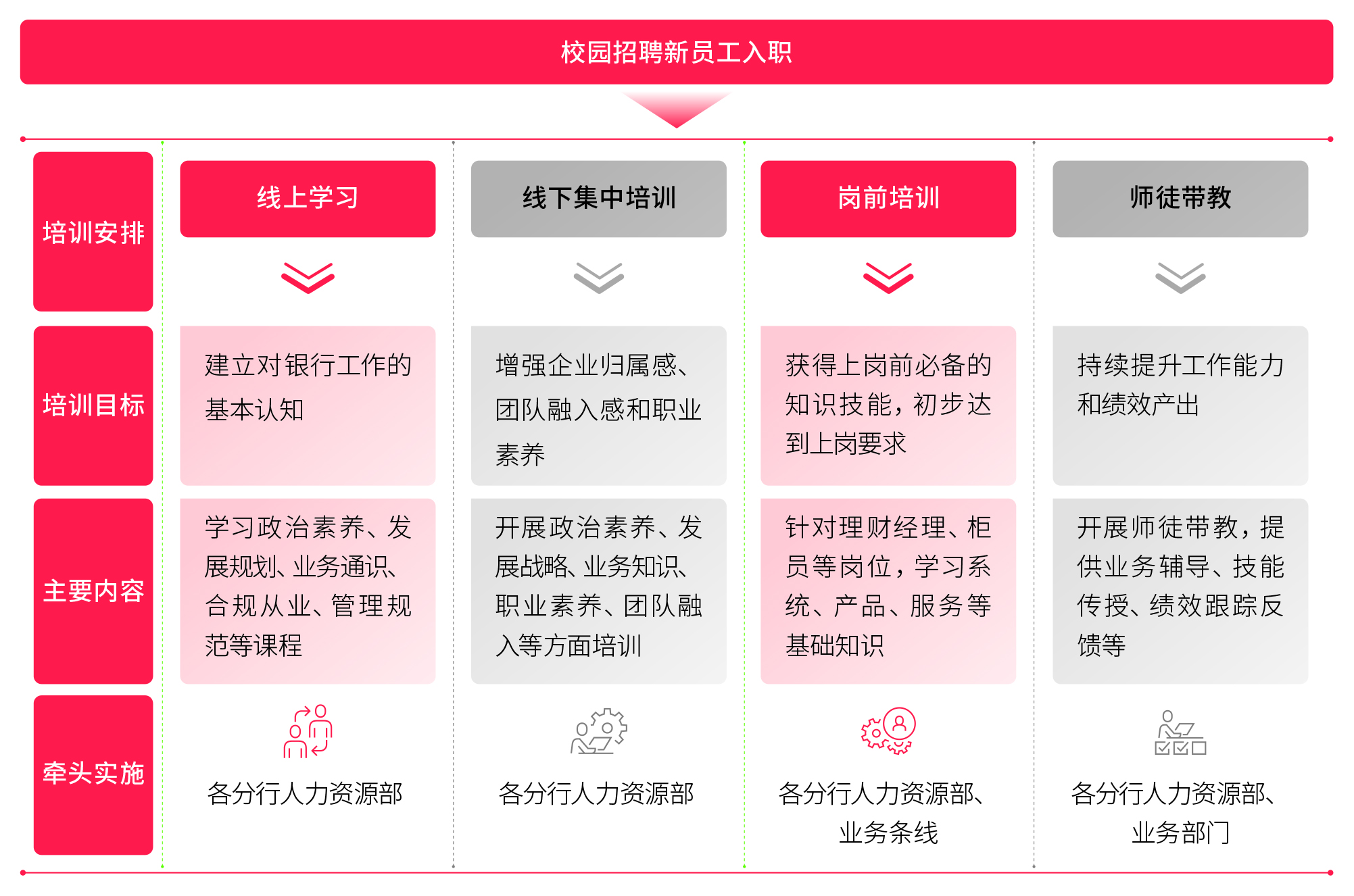 本行积极开展校园招聘、社会招聘新员工培训,培训全面涵盖发展战略、业务通识、合规从业、制度规范等内容,帮助新员工加速融入企业文化和岗位角色。